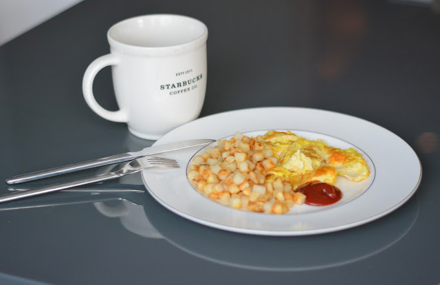 Two egg omelet with mozzarella cheese, red peppers, turkey and onions. Starbucks coffee with whole mild added.