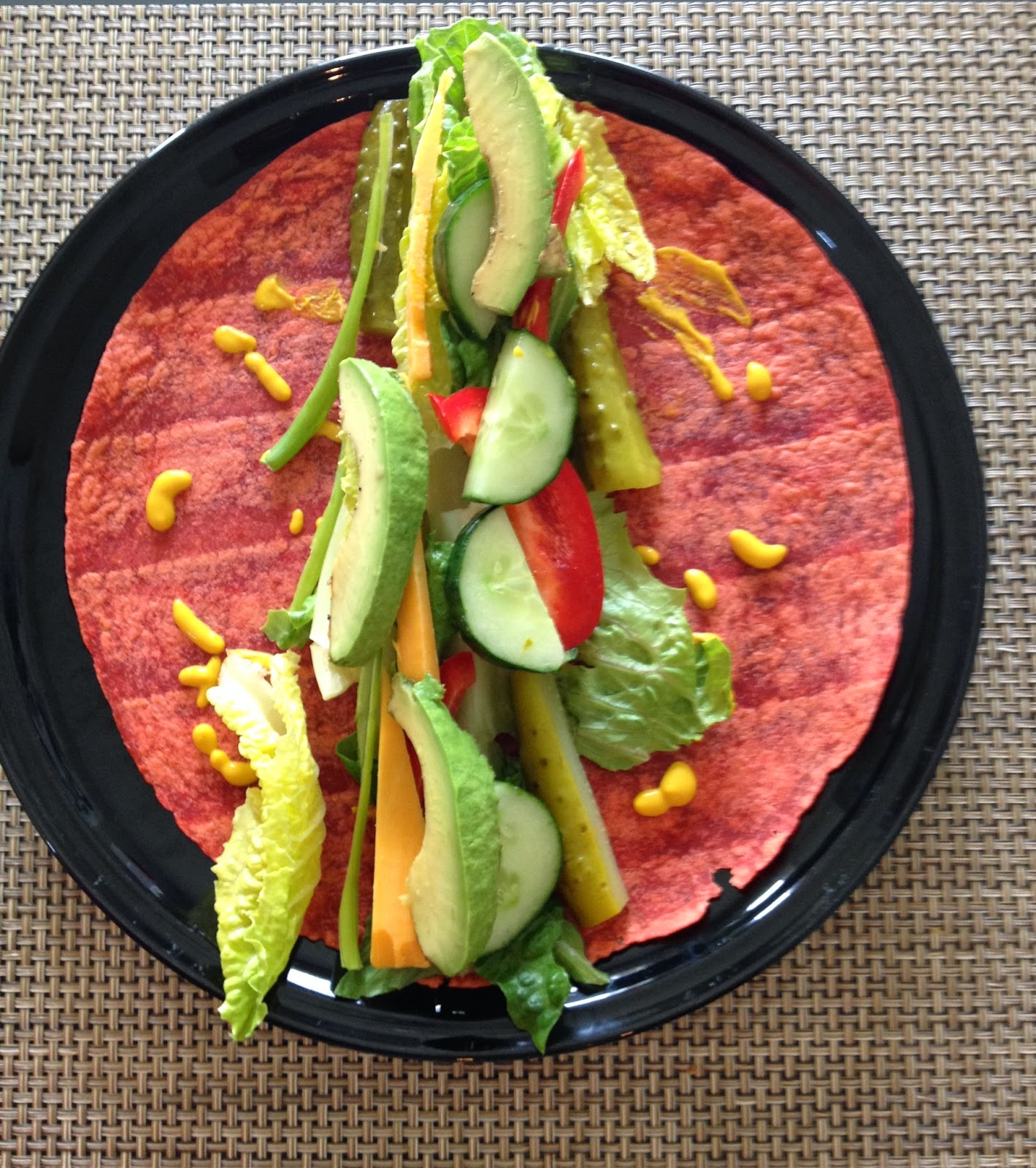 Whole wheat wrap with turkey breast, avocado (YUM), cucumber, red pepper, pickles, lettuce and mustard.